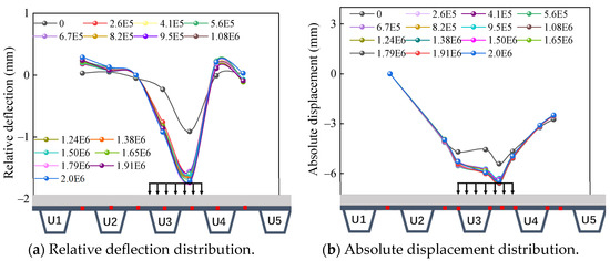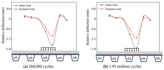 Figure 11a,b depicts the relative deflection distribution resulting from a 300 kN dynamic load and a 300 kN static load applied over 260,000 and 1.91 million cycles, respectively.
