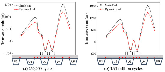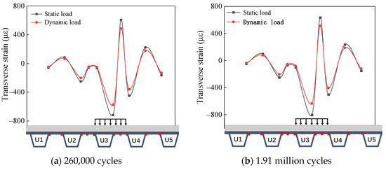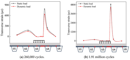 Figure 9 illustrates the transverse strain distribution on the surface of the steel bridge deck resulting from both a 300 kN dynamic load and a 300 kN static load after 260,000 cycles and 1.91 million cycles of loading.