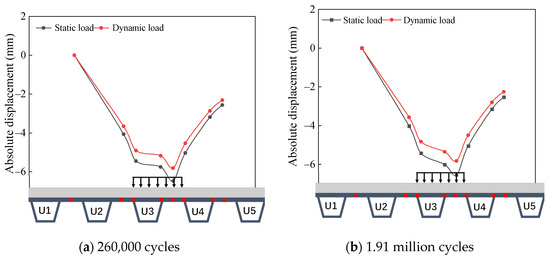 Figure 12a,b depicts the absolute displacement distributions resulting from a 300 kN dynamic load and a 300 kN static load after 260,000 and 1.91 million load applications, respectively.