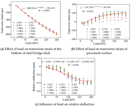 This transverse strain increases with the applied load across different loading stages, and the trend of change is consistent across each stage. As the number of loading cycles increases, the strain value induced by the same test load gradually rises, indicating that the strength of the EAC paving layer gradually decreases with the increase in the number of loading cycles. Thus, the stiffness provided by the paving layer to the steel bridge deck diminishes over time. The relationship between the transverse strain at the bottom of the steel bridge deck and the applied load follows an exponential distribution, with a gentle curve in the fitting relationship, as shown in Figure 13a. This indicates a high elastic modulus for the steel bridge and strong resistance to deformation. At the end of the loading period, the steel bridge deck does not exhibit signs of fatigue.