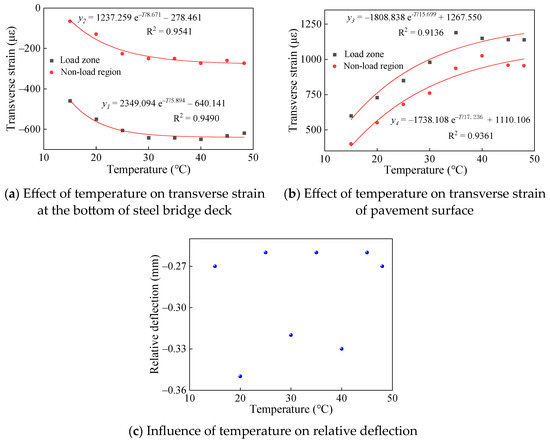 - Considering only the load effect, both the transverse strain and relative deflection increase with the increase in load. The strain exhibits an exponential relationship with the load, while the relative deflection follows a cubic function. When examining the effects of temperature alone, the transverse strain rises exponentially with temperature. The relative deflection is primarily influenced by the load and shows limited sensitivity to temperature variations.