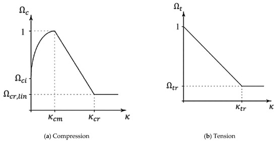 These functions depend on the compression- and tension-hardening variables. The Menetrey–Willam constitutive model offers two softening yield functions: linear and exponential softening functions. In this study, the linear softening function, shown in Figure 8, was used due to the behavior of UHP-ECC. Using the Menetrey–Willam constitutive model with the linear softening yield function in ANSYS requires defining twelve parameters [30]. These parameters are the modulus of elasticity, Poisson’s ratio, uniaxial compressive strength, uniaxial tensile strength, biaxial compressive strength, dilatancy angle, plastic strain at uniaxial compressive strength, ultimate effective plastic strain in compression, relative stress at the start of nonlinear hardening, residual compressive relative stress, plastic strain limit in tension, and residual tensile relative stress. The values of these parameters, shown in Table 3, were recorded according to the experimental results shown in Figure 2, Figure 3, Figure 4 and Figure 5.