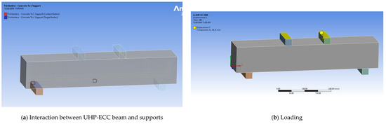 All intersection nodes between the concrete and steel reinforcement were merged to specify that the steel reinforcement is embedded in the concrete. A full bond was assumed between the steel and concrete. In the ANSYS workbench, the contact between the beam surface and the steel loading plates and supports was simulated using the no separation type with the formulation of multipoint constraint (MPC), which was determined by defining the interaction between the contacting surfaces, as shown in Figure 9a.