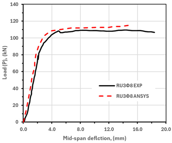 Experimental and FE load-deflection curves for the beam (RU3Φ8).