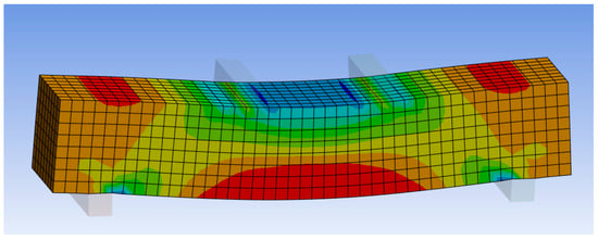 Thirteen simply supported UHP-ECC beams of different lengths and cross-sections of width (b) × height (h) = 175 × 300 mm with an effective depth (d) = 262.5 mm were used for the parametric study. All the beams had a main reinforcement with a yield strength of 400 MPa, while the stirrups were two branches of 8 mm in diameter spaced at 200 mm with a yield strength of 240 MPa. The beams were loaded at their mid-span through a steel loading plate of 100 × 100 × 50 mm. The elements were discretized into (L/50) × (h/6) × (b/4) mm. Figure 15 and Figure 16 show the FE modeling of the concrete (UHP-ECC) and the reinforcement, respectively. For the span (L = 2500 mm), the total number of nodes was 1820, while the total number of elements was 1672.
