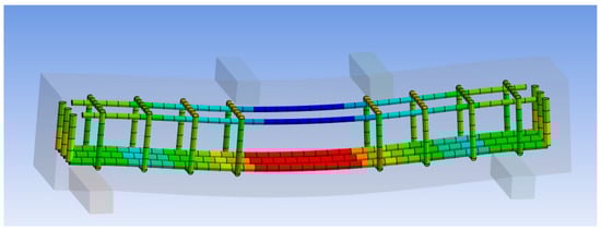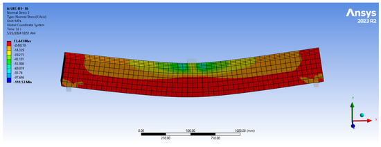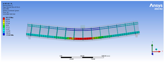Figure 13 and Figure 14 show the normal stress distribution in both the UHP-ECC (in the X-direction) and the reinforcement of the FEM, respectively. In both figures, the maximum compression stress is located around the edges of the loading area at the top of the beam, while the maximum tensile stress is located at the bottom of the beam, mid-span. These results confirm the interconnection between the different elements used in this FEM.