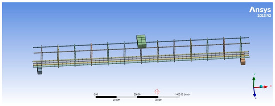 The 3-D eight-nodes brick element SOLID185 was used for the modeling of the tested UHP-ECC beam, steel loading plate, and steel supports. A mesh analysis was conducted, and it was found that the results were approximately the same for the element size of 12.5 mm and less. As a consequence, all the elements were discretized into 12.5 × 12.5 × 12.5 mm elements as shown in Figure 6. The dimensions of the beam were as shown in Figure 1, while the dimensions of both loading plate and steel supports were 25 × 25 × 100 mm. On the other hand, the steel reinforcement, either the bars or stirrups, was modeled using 3-D nonlinear LINK180 elements with length of 12.5 mm, as shown in Figure 7. The total number of nodes was 3861, while the total number of elements was 3436.