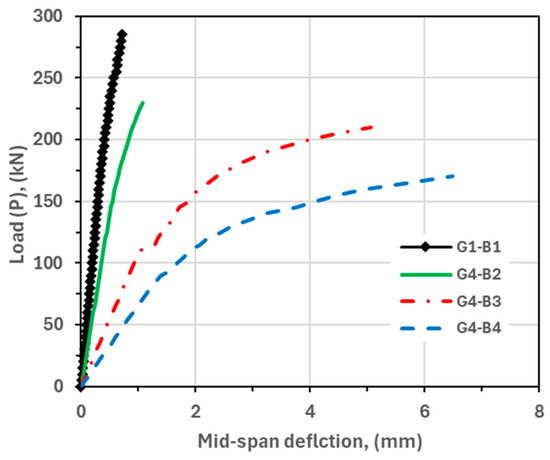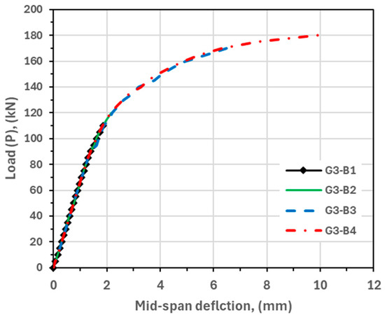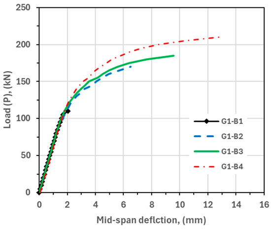 According to the previous classification, beams G1-B2, G2-B3, G3-B3, and G4-B4 were identical and represented this study’s primary dimensions and properties.