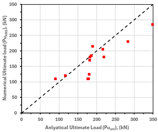 - The analytical model was verified using the numerical (FEM) results. The average value for the ratio between the analytical and the numerical ultimate loads (Pu-anal/Pu-ANS) was 1.15. The coefficient of variation (COV) and the coefficient of determination (R2) were 16.56% and 0.766, respectively. Based on these values, the proposed equations could predict the ultimate loads, and hence the flexural capacity, with acceptable results.