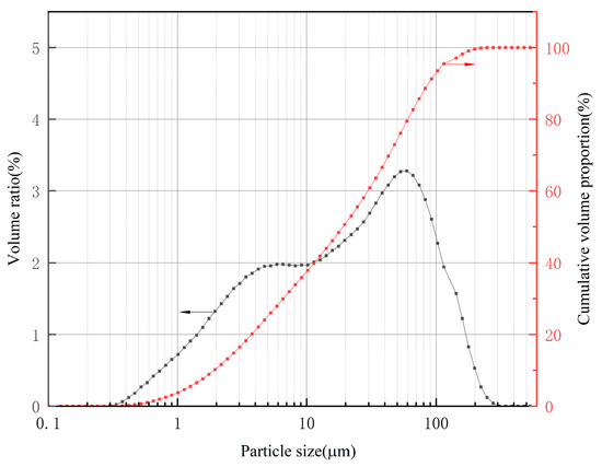 The cements used were calcium sulfoaluminate cement (CSA) and ordinary Portland cement (OPC). The CSA was produced by Dengfeng Dengdian Group, with a strength grade of 42.5. The OPC was produced by Xuancheng Conch Cement Co., Ltd., Xuancheng, China, also with a strength grade of 42.5. The chemical composition of both types of cement is presented in Table 1. The particle size distribution of OPC is illustrated in Figure 1, while that of CSA is shown in Figure 2 (The black line indicates the volume ratio, and the red line indicates the cumulative volume ratio).