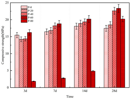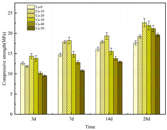The effect of OPC content on the compressive strength of the specimens is shown in Figure 4. In the absence of OPC, the specimens exhibit a significant early strength but a slow increase in strength in the later stages, and even a phenomenon of strength regression at 28 days. This is because, with the advancement of hydration, further transforms into ettringite (AFt), which accumulates in confined spaces and releases a large amount of expansion energy, making it prone to crack formation and propagation. This leads to a loose structure of the cementitious hardened body and ultimately results in a decrease in compressive strength in the later stages [25].