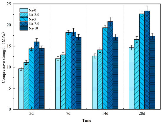 The effect of sodium aluminate dosage on the compressive strength of OPC-CSA specimens is illustrated in Figure 6. With the increase in the dosage of sodium aluminate, the compressive strength of OPC-CSA specimens at various ages generally follows a pattern of initial increase followed by a decrease, and an optimal dosage of 0.75% sodium aluminate is identified as the best incorporation level in the experiment, as it yields the maximum compressive strength at all ages. When the dosage of sodium aluminate does not exceed 0.75%, its incorporation can enhance the compressive strength at all periods. The compressive strengths of the Na-2.5 group at 3 days, 7 days, 14 days, and 28 days are 105%, 107%, 111%, and 112%, respectively, compared to the Na-0 group.