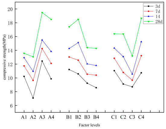 To investigate the interactive effects of sodium aluminate, quicklime, and gypsum in OPC-CSA composite cement, further analysis was conducted on the orthogonal test results (Table 5) by taking the average values of the same factors at the four levels and then performing range analysis. The patterns of influence of factors A, B, and C on compressive strength were obtained, as shown in Figure 7.