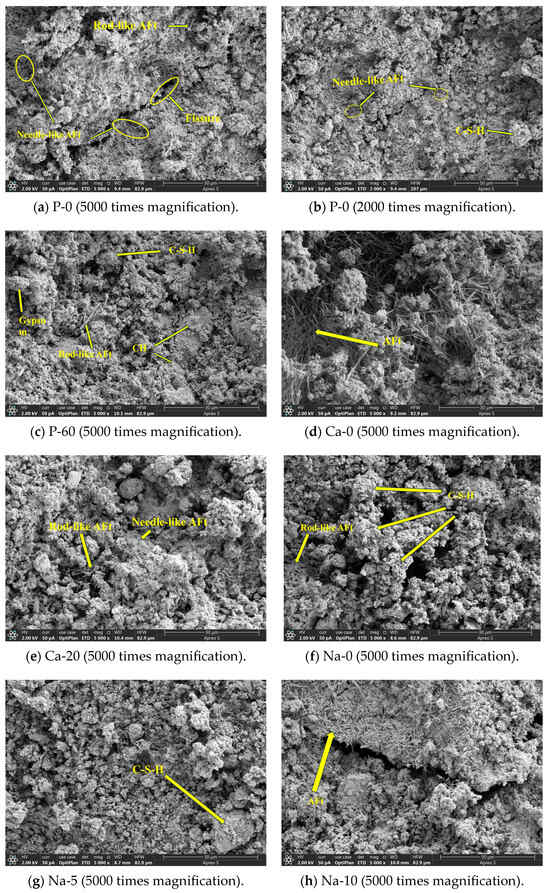 Figure 8f shows the condition of the specimen without the addition of sodium aluminate (Na-0). It can be seen that there is an insufficient formation of ettringite, resulting in a loose structure and a decrease in compressive strength. Figure 8g shows the condition of Na-5, indicating that the incorporation of sodium aluminate promotes the formation of ettringite, thus allowing it to combine with , making the Na-5 specimen more compact and uniform compared to the Na-0 specimen. Figure 8h shows the condition of Na-10, where an excess of sodium aluminate leads to an overproduction of ettringite, accompanied by a significant release of energy, which can cause cracks. Compared to the Na-5 specimen, the Na-10 specimen is more compact and uniform, but due to the presence of larger and more complete cracks, the strength is reduced.