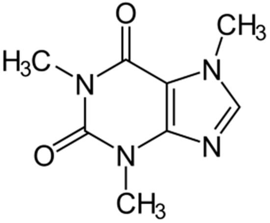 One such substance is caffeine (C8H10N4O2; 1,3,7-trimethylxanthine). This organic substance (Figure 1) could replace some hazardous organic substances and nanoparticles as biocide components of building materials. Generally, it is known for its stimulating effects on the nervous system of humans owing to its presence in various drinks, foods, cosmetics, and medicinal products [,], but attention has also been paid to its pesticidal effects in agriculture and forestry against nematodes and insects [,].