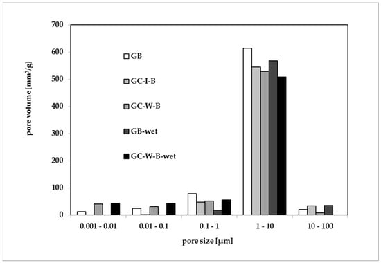 The basic physical properties of the studied plasters are described in Table 2. Setting time was the same for controls as well as immersed samples and slightly longer (initial time about 15% and final time about 9%) for samples mixed with caffeine. It indicates no significant effect of caffeine on the setting time of gypsum, similar to a study with cement pastes []. The matrix density of dried samples was the same for the control samples as for both variants with caffeine treatment; for wet samples, it was somewhat lower. Bulk density was similar for all samples. The changes in total porosity were relatively small, up to 3%, and reflected the variations in matrix density. The pore size distribution is shown in Figure 2. Pores with a size of 1–10 μm were the most represented in the samples. No significant difference was found between caffeine-containing samples and control samples or between dry and wet samples.