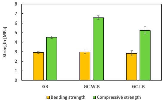 Three prismatic samples (160 × 40 × 40 mm) of each mixture prepared for strength testing were stored in laboratory conditions for 7 days. The bending and compressive strengths of each sample were determined according to [] using a mechanical press FP 100 (VEB Industriewerk Ravenstein, Schalkau, Germany). A three-point test was performed on dried samples to determine the bending strength. The compressive strength was measured on the halves of the specimen after the bending test. The strength was determined as an average value.
