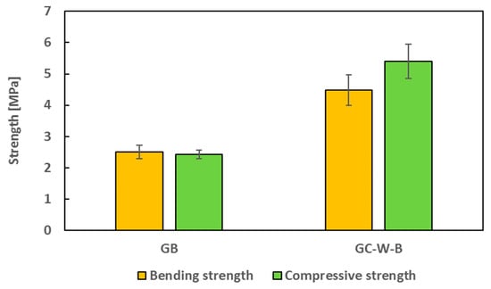 The samples were prepared according to EN 13279-2 [] as follows: the control sample (G-B)—900 g of binder)—was mixed with 720 mL of water; the sample with caffeine solution (GC-W-B)—900 g of binder)—was mixed with 720 mL of a caffeine 2% (20 g/L) aquatic solution; the sample immersed in caffeine solution (GC-I-B)—900 g of binder)—was mixed with 720 mL of water and then immersed in a caffeine 2% (20 g/L) aquatic solution. The mixing time was reduced to one minute (60 s in an automatic mixer Matest, E093, at a low speed of 140 rpm). The samples were unmolded after 24 h and stored under laboratory conditions at (23 ± 2) °C and a relative humidity of (50 ± 5%) for six days. Before testing, samples were dried at 40 °C for 24 h.