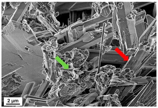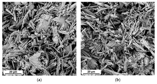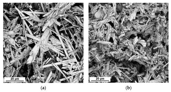 The immersion of samples (G-B and GC-W-B) in water for 21 days also brought some differences between their gypsum crystals (Figure 11). Gypsum crystals were longer and more developed in the GC-W-B wet sample than in control sample G-B, where the crystals were often underdeveloped with more crystal aggregates.