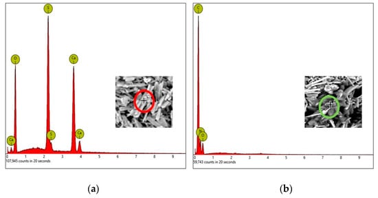 Elemental analysis gained by EDX: (a) diagram of gypsum + photo with used point (signed by red circle) and (b) diagram of caffeine + photo with used point (signed by green circle).