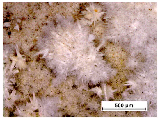 Photo of caffeine crystallization on the surface of gypsum sample (GC-W-B). The image was acquired with a digital microscope ZEISS Smartzoom 5 (Carl Zeiss AG., Oberkochen, Germany) at 200× magnification. Subsequently, brightness and contrast were adjusted in ZEN lite software (ver. 3.10, Carl Zeiss AG., Oberkochen, Germany), and a scale bar was added to the image.