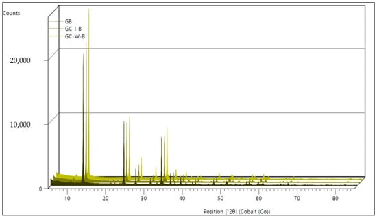 Diffractograms of tested plasters: GB = control gypsum plaster, GC-I-B = gypsum plaster immersed in caffeine solution, GC-W-B = gypsum plaster containing caffeine in mixing water.