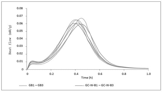 Heat flow during the first hour of the experiment with G-B and GC-W-B samples. GP1 to GP3 = control gypsum plaster without caffeine (GB), GC-W-B1 to GC-W-B3 = gypsum plaster containing caffeine in mixing water (=GC-W-B samples).