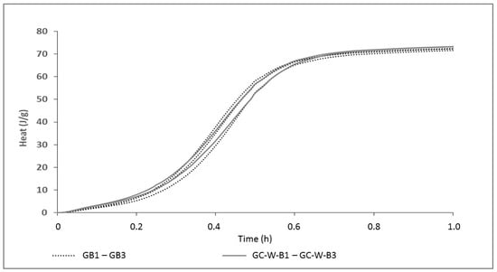 Cumulative heat during the first hour of the experiment with G-B and GC-W-B samples. GP1 to GP3 = control gypsum plaster without caffeine, GC-W-B1 to GC-W-B3 = gypsum plaster containing caffeine in mixing water (=GC-W-B samples).