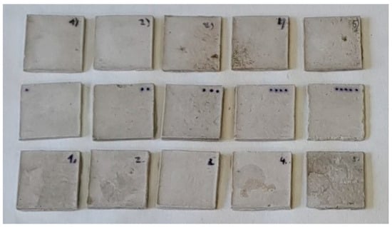 Samples after storing in desiccators after 6 months of exposition. The samples are displayed in order from top to bottom: the samples immersed in caffeine solution, samples mixed with caffeine, and control samples without caffeine. Samples denoted as „1–5“ = the control samples (G-B), samples „points from 1 to 5“ = the samples immersed in caffeine solution (GC-I-B), samples „1.–5.“ = the samples mixed with caffeine solution (GC-W-B).