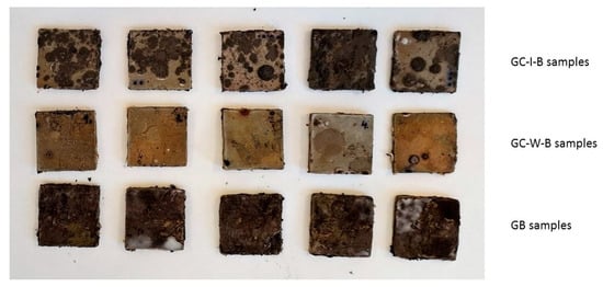The caffeine in the solution (the samples GC-I-B), which was in contact with the plaster mainly on its surface, did not logically penetrate as much and, thus, did not have the opportunity to prevent mold growth through the whole sample volume. In addition, caffeine stuck only partially to the surface of the immersed samples (GC-I-B). On the parts without caffeine, molds could grow and profit (Figure 16). Their biological activity was lower probably also due to the lower caffeine amount interacting with the plaster. On the contrary, the GC-W-B samples contained more caffeine, and it is logical that the fungicide effect was higher.