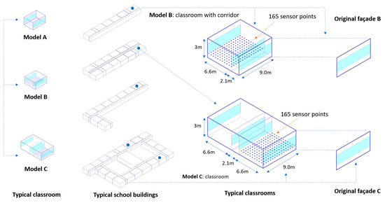 Figure 2 displays the typical floor plans of school buildings and typical classroom spaces, simulation classroom unit dimensions, and the number of sensor points. There are two types of typical classroom building spaces, subsequently modeled in Rhinoceros for later simulations. Based on the spatial function and dimensions of facade openings, as well as differences between internal and external corridors, three categories are defined as simulation units: Model A, B, and C, representing origin classroom space, external corridors on the south side of classrooms, and internal corridors between two classrooms, respectively. This simulation primarily compares the applications of Models B and C within the actual urban climate environment, while Model A is utilized solely as a basic reference for the classroom’s spatial layout. Typical classroom space features include a width of 6.6 m, a depth of 9 m, a ceiling height of 3 m, and window heights of 1.1 m and 1.2 m; both internal and external corridor widths are 2.1 m; and 165 sensor testing points are uniformly set at a height of 0.7 m from the floor.