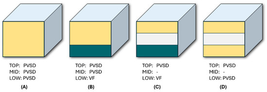 Overall design and prototype variability as shown in Figure 3, the initial partitioning possibilities of the prototype are as follows: Figure 3A Top, middle, bottom (PVSD); Figure 3B Top, middle (PVSD), bottom (VF); Figure 3C Top (PVSD), middle (none), bottom (VF); Figure 3D Top (PVSD), middle (none), bottom (PVSD).