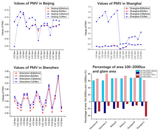 In the bottom left chart, overall, the range of PMV variation in Shenzhen is very narrow, concentrated between 0.52 and 0.59, indicating a generally consistent warm and comfortable indoor environment. Both Shenzhen-B (before) and Shenzhen-B (after) models show very small changes in PMV values, exhibiting high stability, especially between 3 pm and 6 pm on June 22 and December 22, with almost no significant changes. Shenzhen-C (before) and Shenzhen-C (after) show slightly more fluctuation, especially on September 22 and December 22, with more pronounced changes in PMV values, particularly a noticeable drop at 3 pm on December 22. Overall, the smaller changes in PMV in Shenzhen indicate that buildings in this region maintain relatively consistent thermal comfort across different seasons and times, with much smaller fluctuations compared to Beijing and Shanghai. This may reflect Shenzhen’s relatively stable and comfortable climatic conditions, with building design being less sensitive to climate variability.