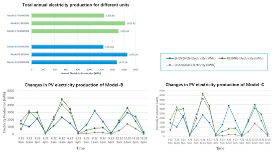 Through the computational analysis of the power output of optimized models at different times of the day in Figure 6, it was found that the power generation trends of Model B and Model C are generally consistent. Both models exhibit lower power production in the morning, peak around noon, and then decrease, gradually dropping to zero by about 6 PM as sunlight fades. The only exception is the power generation trend in Shenzhen in March, which peaks around 3 PM, likely due to unstable weather conditions during the simulation day. A comparison of the overall power generation over several months reveals that for both Beijing and Shanghai, June features the highest power output of the year for Models B and C, with a significant gap between the best and worst months. In Shenzhen, the optimal power production occurs in September, with the poorest performance in March, but overall, due to Shenzhen’s consistently ample sunlight throughout the year, the difference between the best and worst months is small. A numerical comparison between Models B and C indicates that Model C generally performs better in Shenzhen, Model B performs better in Beijing, and there is little difference between Models B and C in Shanghai.