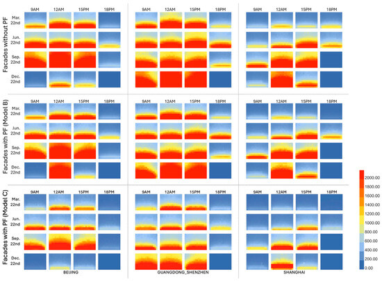 The simulation results for Model B and Model C spaces indicate that the best facade combination in any city is to have photovoltaic shading on all three sections—top, middle, and bottom—but they differ in the size of the photovoltaic panels and their angle relative to the horizontal plane. For Model B, the best prototype angle is 40° in both Beijing and Shenzhen, while it is 30° in Shanghai. For Model C, on the other hand, the best angle is 30° in both Shenzhen and Beijing, and 40° in Shanghai. Regarding the size of the photovoltaic panels, both Model B and Model C use 0.4 m in Beijing, while in Shenzhen and Shanghai, they use 0.8 m for optimal overall effects. Specific PV panel settings can be seen in Table 4 and Table 5.