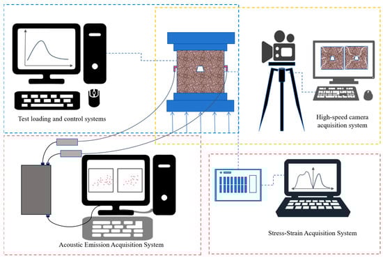 The test was conducted using the loading device for the TAW-2000 microcomputer control electro-hydraulic servo universal testing machine. The test system can perform a real-time recording of the specimen loading process of force and displacement data, through the supporting analysis software, which can be obtained from the stress–strain data test loading end and the control system, as shown in Figure 2. The test adopted a displacement-controlled loading mode, where the loading rate was 0.02 mm/s. A high-speed camera was used to collect the whole process information of the sandstone specimen from contact to compression density until the final destabilization and destruction of crack germination and development to the final penetration. We can also conduct real-time monitoring of the whole process of sandstone stress–strain data with the stress–strain acquisition device. With the help of the acoustic emission instrumentation, used to detect acoustic signals during the whole process of the test, we can show their time–space and time–strain data during the rupture gestation process and their spatial and temporal distribution during the rupture brewing process. The threshold was set to 100 dB to eliminate the high signal-to-noise ratio. The acoustic emission probe was fixed to the middle part of both sides of the specimen with a rubber strap, while a petroleum jelly reagent was used to couple the acoustic emission probe to the specimen.