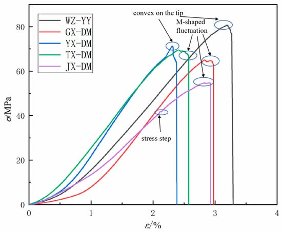 By analyzing the stress–strain curves of the four section morphologies and the intact sandstone specimens, as shown in Figure 3 below, the data of the ultimate compressive strength, peak displacement, and modulus of elasticity of the prefabricated sandstones with different section morphologies under uniaxial compression were obtained, as shown in Table 2.