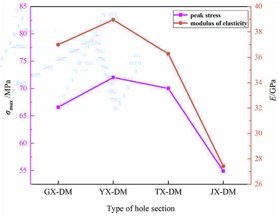 A comparison of the peak failure strength and the elastic modulus for the different cross-sectional shapes is shown in Figure 4. As can be seen from the figure, the relative errors of the elastic modulus among each group of samples with circular, trapezoidal, straight-wall circular-arch, and rectangular shapes are all relatively small, indicating that the selected samples are mostly homogeneous in texture and similar in internal pore structure and distribution. Compared with the intact samples, the average peak compressive strengths of the circular, trapezoidal, straight-wall circular-arch, and rectangular cross-sectional hole samples were 88.40%, 86.03%, 81.74%, and 67.37% of the average peak compressive strength of the intact rock, respectively. The experimental data show that the circular cross-sectional hole had the lowest weakening effect on the compressive strength of the sandstone samples in terms of structure, with only an 11.6% reduction compared to the ultimate compressive strength of the intact rock samples, while the rectangular cross-sectional hole led to the most significant strength reduction, with a decrease of 32.63%. This is because, when the circular hole is subjected to force, the stress distribution is relatively more uniform, due to the symmetry of its shape. This uniform stress distribution helps to reduce local damage to the sample during compression, thereby delaying the overall failure process. The circular hole has no sharp edges, so it is less prone to stress concentration. Stress concentration is one of the important factors leading to material failure, and the design of circular holes effectively reduces this risk. Square holes are more prone to stress concentration at their sharp edges. Stress concentration can cause local stress to exceed the material’s strength limit, leading to crack propagation and sample failure. This failure often occurs at lower stress levels, so square holes have a more severe weakening effect on the compressive strength of the samples. A square hole creates a relatively larger material discontinuity in the sample. This discontinuity can lead to uneven stress distribution around the hole, further exacerbating the stress concentration phenomenon. At the same time, this discontinuity also provides a path for crack propagation, reducing the overall strength of the sample.