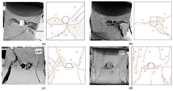 It can be observed that the crack derivation patterns of the trapezoidal-hole and straight-wall domed hole specimens are well characterized by symmetrical damage along both sides of the main axis. As shown in Figure 5c, firstly, the stress on both sides of the trapezoidal-hole specimen is transmitted downward, which then produces two larger tensile cracks (B1 and B2), and, at the same time, due to the specificity of the two bottom corners of the trapezoidal shape, it has a certain rupture-inducing effect on tensile crack B2, and then reaches the crack-initiating stress of 27 MPa on the left side, which produces two more obvious tensile cracks (B2 and B3) on the left side of the rock sample. Thereafter, the local stress of the specimen reaches 27 MPa. Here, the local stress of the specimen reaches its stress limit, and microcrack penetration damage produces a crushed spalling zone in the right middle region of the specimen. Similar to the trapezoidal shape, the straight-wall domed specimen produces multiple more uniform tensile cracks (B5, B6, B7, B8, and B9) in the upper part of the specimen at the early stage of compression, and, at the same time, the initial cracks on the left side of the hole cross-section also extend approximately along the direction of the expansion of the original cracks in a tensile damage pattern toward the loaded end face to form crack-breaking surface Q5.
