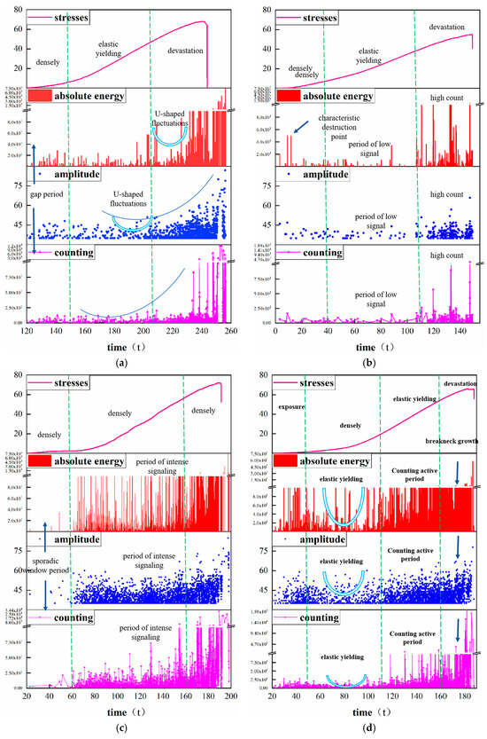 To comprehensively analyze the AE events (stress-absolute energy-amplitude-ringer counts), diagrams of sandstone with four different pore section morphologies were created, according to the law analyzed in Section III, which show the acoustic emission characteristics of the axisymmetric-shaped pore (straight-wall domed and trapezoidal). They show the characteristic attributes of high energy, high amplitude, and high counts, referred to as the “three highs.” The acoustic emission characteristics of holes (circular and rectangular) in a centrosymmetric shape show the characteristic attributes of high energy, low amplitude, and low counts, referred to as high-energy–low-amplitude–low-count, which are “two lows and one high.” In terms of a local comparison, from the specimen-loaded stress curve and acoustic emission ringer counts, the acoustic emission energy curve correspondence can be seen, the stress occur suddenly, and the drop acoustic emission ringer counts and acoustic emission energy appear as a surge phenomenon, but ringer counts surge and acoustic emission energy show a surge phenomenon, and the stress curve does not necessarily show sudden drop changes, and, at the same time, we observed the sandstone specimen before the peak stress. At the same time, observing the “silent period” before the peak stress and the “silent period” of acoustic emission parameter changes, it can be clearly found that the “silent period” of acoustic emission parameter changes does not mean that the destructive deformation field of the rock is in a stable stage, however, in the peak stress of the specimen, the stress curve does not necessarily undergo a sudden drop. On the contrary, in the “quiet period” before and after the peak stress of the specimen, the acoustic emission parameters have more obvious violent fluctuations, according to the research of Song Yimin et al. [], due to the localization of the deformation during this period brought about by the size of the specimen and the value of the obvious increase.