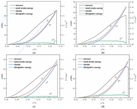 In uniaxial compression tests, the mechanical energy input to the press is mainly converted into the elastic strain energy, plastic deformation energy, and thermal energy of the specimen [,]. Specifically, as the stress increases, the specimen first undergoes an elastic deformation stage, at which time the input energy is mainly converted into elastic strain energy within the specimen, which is stored in the form of potential energy in the microstructure of the material. When the stress exceeds the elastic limit of the material, the specimen enters the plastic deformation stage, at which time the input energy continues to be converted into elastic strain energy, but is also significantly converted into plastic deformation energy, which involves the irreversible energy dissipation of the material’s internal dislocations, slip, and other microscopic mechanisms. At the same time, due to friction, microstructural rearrangement, and possible phase transitions during deformation, some of the input energy is also converted into thermal energy, resulting in a localized or overall increase in specimen temperature. These energy conversion processes together determine the stress–strain relationship, damage mode, and energy dissipation characteristics of the specimen during the test. In this paper, we will analyze the energy evolution characteristics under uniaxial compression with different pore morphologies in conjunction with the stage of stress–strain curves observed during the loading process. The evolution trend of energy under uniaxial action with the strain growth for the sandstone specimens with different pore section morphologies is shown in Figure 9.