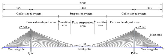 Structural diagram of the hybrid cable-stayed and suspension (HCSS) bridge system (unit: m).