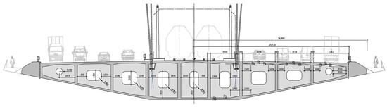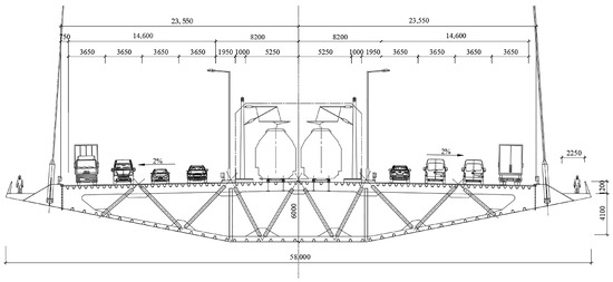 This study examined a combined road and railway bridge that features both cable-stayed and suspension designs, with a main span of 1440 m. The bridge utilizes a modified Dissing system, featuring a span arrangement of 375 m, 1440 m, and 375 m, with a total deck width of 58 m. Three auxiliary piers are positioned at the side spans. The central section includes a double-track railway, flanked by four road lanes on either side. The primary beam configuration employs a hybrid beam structure. The main span consists of a steel box girder, measuring 6 m in height and 58.5 m in width, while the side spans consist of concrete girders, with a height of 5.5 m. The elevation of the bridge, along with the cross-sections of the central steel box girder and the side concrete girders, is illustrated in Figure 1, Figure 2 and Figure 3, respectively. The key parameters of the bridge are summarized in Table 1.