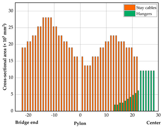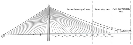 The cable system includes the main cables, stay cables, and hangers. The main cables consist of two strands, each made up of 127 wire ropes, with a rope diameter of 723 mm. The stay cables are arranged in a double-layer configuration with 22 pairs for both the main and side spans, spaced 16 m longitudinally along the girder and 2–3 m vertically along the pylons. The transition area measures 240 m in length. The bridge uses 32 pairs of hangers, 10 of which are located in the transition area, with a longitudinal spacing of 24 m along the girder. The numbering diagram of the mid-span stay cables and hangers is shown in Figure 4. Its cross-sectional area is shown in Figure 5.
