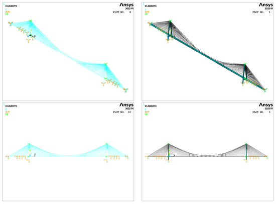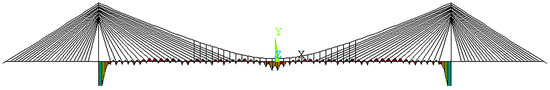The spatial geometric nonlinear finite element model used in this study was developed with the general-purpose finite element software ANSYS 2022 R1. In this model, three-dimensional truss elements (LINK10) simulate the cable system, designed to only experience tensile forces. The main girder and pylon are modeled with three-dimensional beam elements (BEAM4), and the main girder is represented as a single girder. Geometric nonlinear effects of the structure are considered during the calculation process. The spatial finite element model developed in this study is shown in Figure 6.