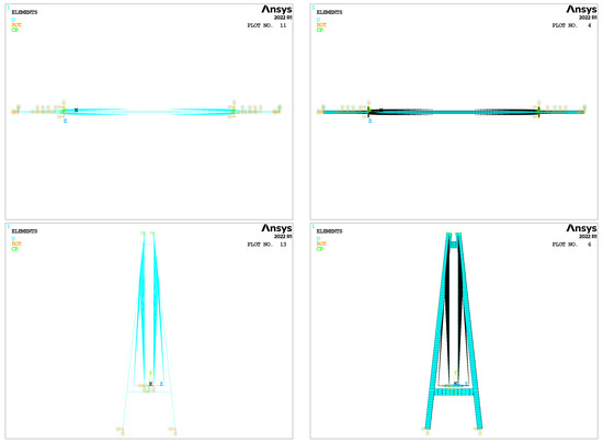 Due to the unique structure of the HCSS bridge system, a concrete box girder is used for the edge spans, while a steel box girder is used for the mid-span. The main girder and the bridge pylon are both made of steel. The specific elements and material properties used in this model are shown in Table 2, aligning with the actual engineering design values. In this setup, the mechanical properties of the LINK10 element are configured to allow only tensile forces (no compression), and its lateral stiffness is ignored. Both the main girder and the main tower are modeled using the BEAM4 element, which represent beam structures. For the material properties, classic constitutive models are applied for both concrete and steel.