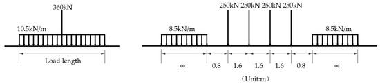 Live loads in the finite element model are selected based on Chinese standards [31,32]. The vehicle load is defined as a Class I highway load, and the train load is specified as a ZK high-speed railway load, as shown in Figure 7. Each load is applied longitudinally to its corresponding lane.