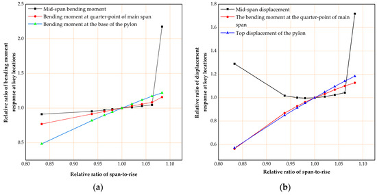 Impact of span-to-rise ratio on structural static performance: (a) bending moment at key locations; (b) displacement response at key locations.