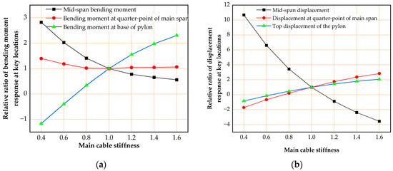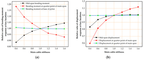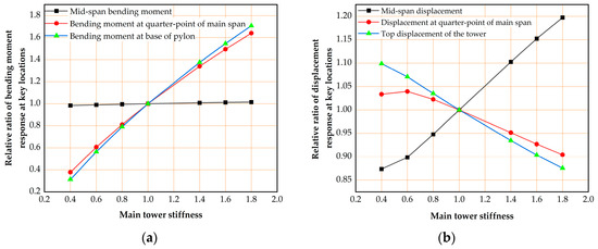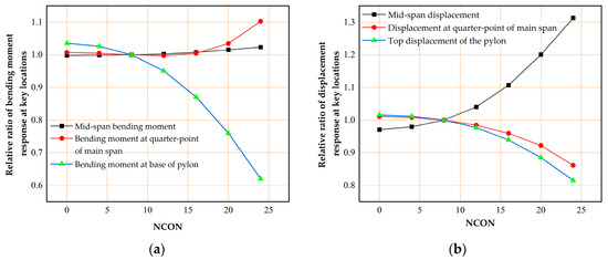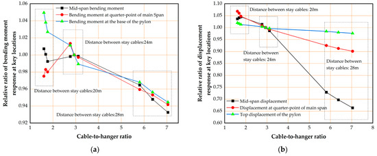 In an HCSS bridge, the span-to-rise ratio is defined as the ratio of the sag of the main cable to the length of the main span. The span-to-rise ratio is varied by adjusting the height of the pylons while keeping other parameters and load conditions unchanged. This analysis examined the response of key structural locations under different span-to-rise ratios, as illustrated in Figure 11.