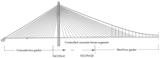 Therefore, this section selects the following parameters for the optimization of the HCSS bridge: span-to-depth ratio, cable-to-hanger ratio, pylon stiffness, stay cable stiffness, main cable diameter, stay cable diameter, and the position of the composite steel-concrete interface. The values of these design variables during the optimization process are specified in Table 4.